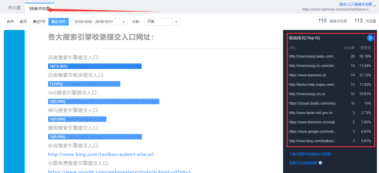 此外,百度热力图还有一个功能是【链接点击图】,通过这个功能,可以看到我们的页面上的链接在一定时间段的点击量,如下图所示:
