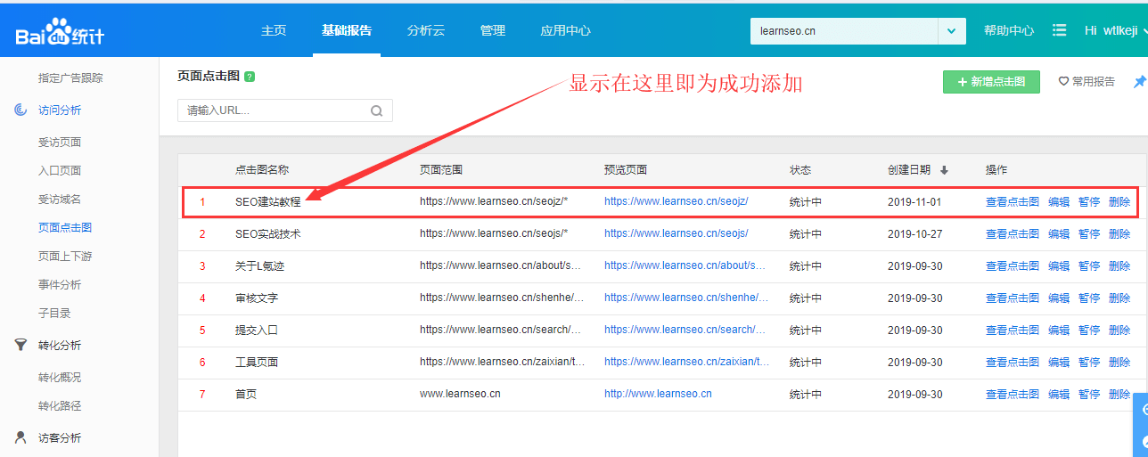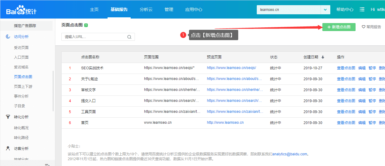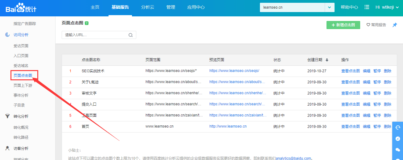 L氪迹佛山SEO技术教程学习网在这里以百度统计后台为例子,图文分享一下页面点击热力图是在哪里安装的?