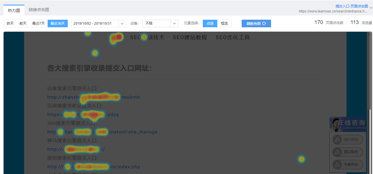 以上便是页面点击热力点击图的安装过程,安装好之后,等待几天有了足够的数据,就能看到统计后的效果了,下面以L氪迹免费SEO教程网-搜索引擎收入口页面的热力点击图为例子,讲解一下百度页面点击热力图如何查看: