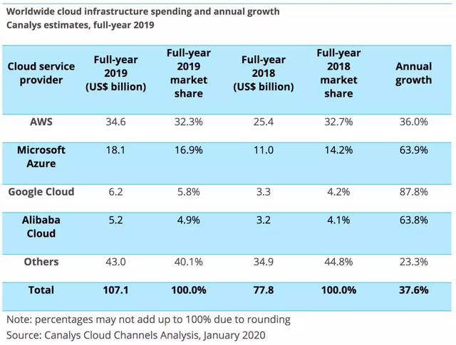Canalys发布的最新2019年全球云市场份额数据,数据显示:2019年全球云计算支出猛增37.6%,达到1071亿美元。