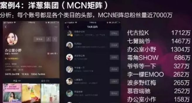 3. MCN矩阵:洋葱集团凡是做抖音运营的,应该都非常熟悉这个名字!一个活在抖音精选里的专业集团,打造了许多我们耳熟能详的抖音红人:代古拉K、七舅脑爷、办公室小野、毒角show、爷爷等一下、李一檬EMOO、波多野红梅、慕容瑞驰、办公室小作、铲屎官阿程……一个创造了总粉丝7000万神话的专业集团,当然是众多抖音运营团队学习借鉴的榜样啦!