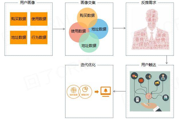 如下图,我们将用户分群划分成了”购买数据、地址数据、使用数据、行为数据“等4个维度,将这4个维度的人群,做交集,得到更精准的人群画像,进而反推用户需求。