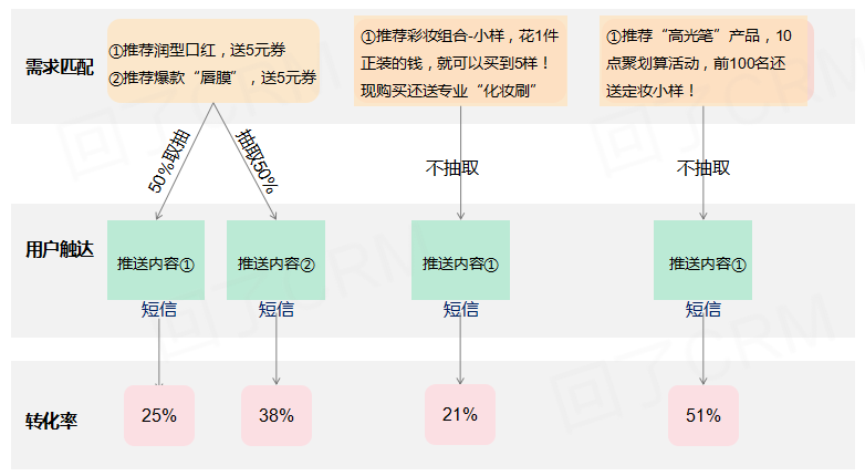 例如,我们根据一组人群画像,反推除了这个组人群3种需求,那么,如果单次的触达是短信,一般会受到文字的限制,也考虑到用户体验,一次不会推送太多信息。所以针对反推出来的3个需求,我们也不确定哪个需求是最准确的。