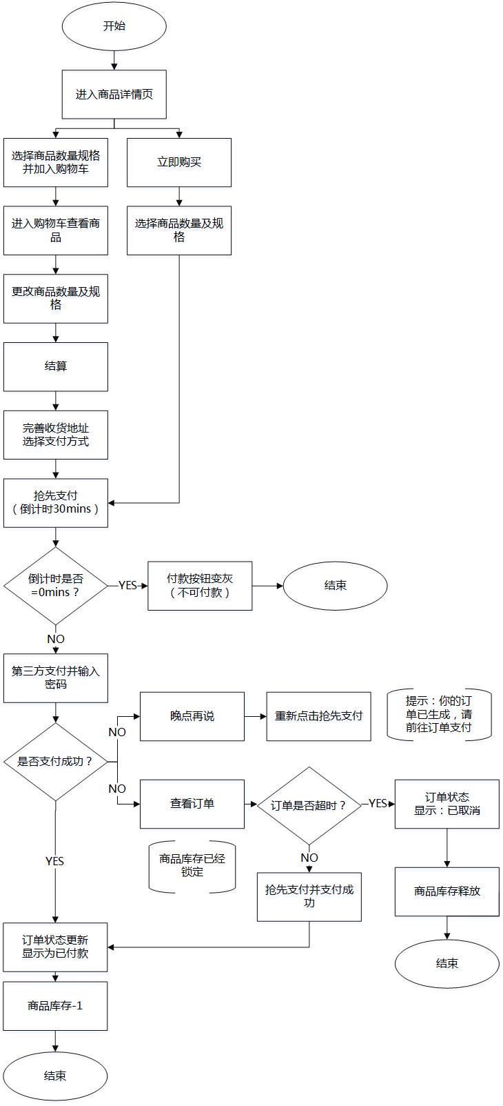 支付流程:首次进入支付详情页后,会触发30mins倒计时,但并未生成待支付订单,返回再次进入支付详情页会重新触发30mins倒计时;超过时间未支付,订单自动取消;支付失败时,生成待支付订单,同时锁定库存,并触发30mins倒计时,超过时间未成功支付,订单会自动取消;支付成功后,订单状态变为待发货。