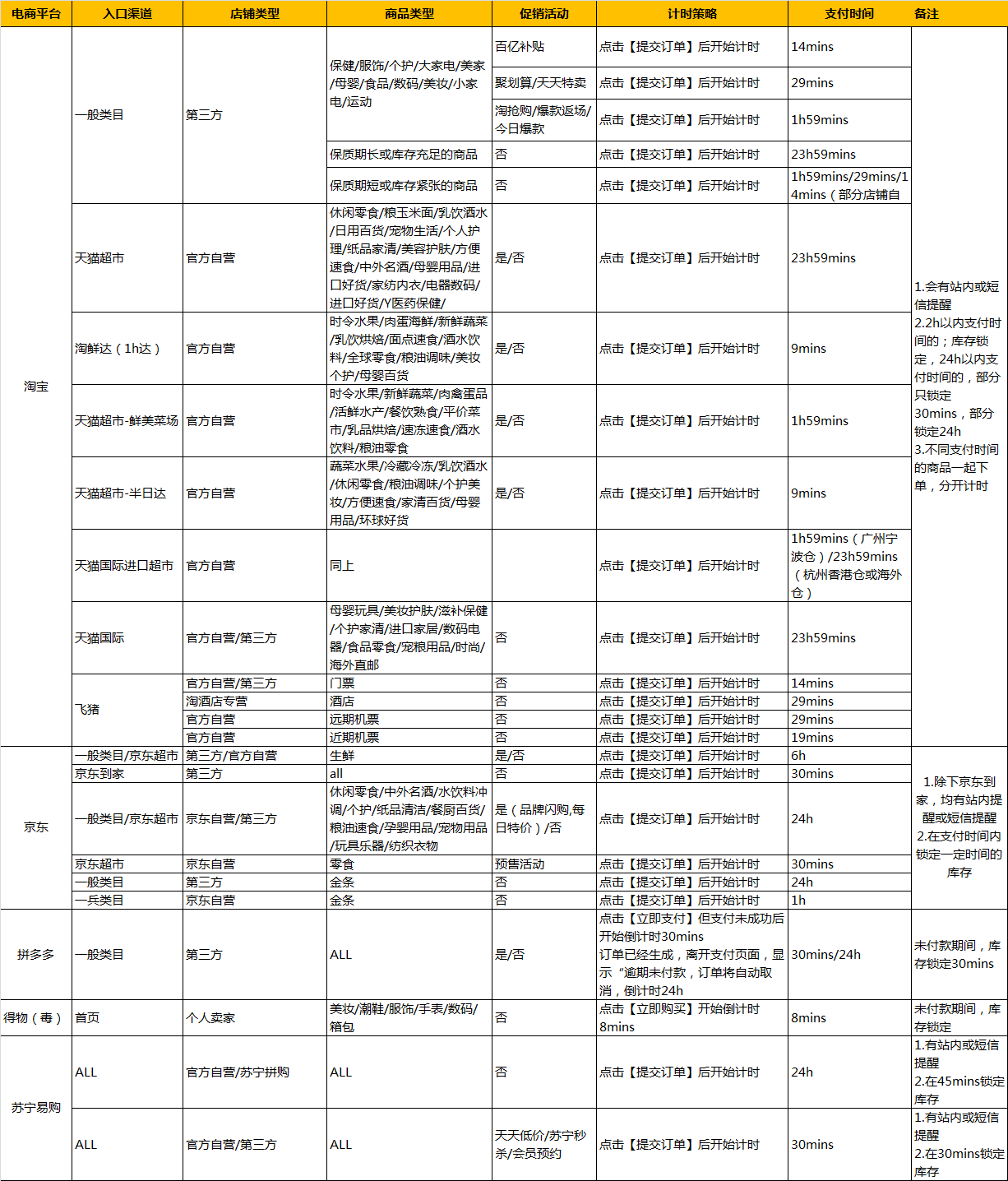支付时间=24h,平台的商品锁定30mins/ 24h;苏宁易购锁定45mins。