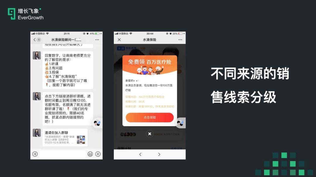 通过售前转化团队为期1~3周的社群课教育过,并且付费9.9元咨询顾问的用户,被列为A+级,交给后续电销团队承接时,转化率是最高的。而通过水滴保公众号因领取赠险而留手机号的,基本被归为C级或以下。