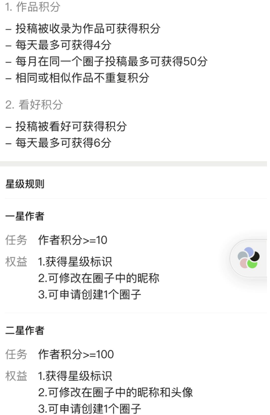 目前的规则很简单,只要在圈子里面获得10个积分就可以了。坚持投稿优质内容,被收录就可以获得积分,平台有具体的大家看下图规则: