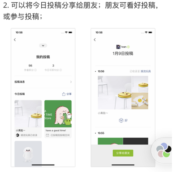 进入圈子首页,点击右下角的+号,就可以投稿。稿件会去往两处,一是你投稿到具体的圈子,二是“投稿空间”,系统会根据用户的投稿内容推荐给适合的圈子,圈子有收录意向时将向用户提出申请,若你通过,投稿即被收录为作品。