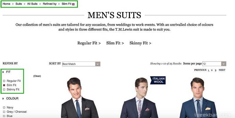 如下图所示,在TM Lewin网站中,面包屑导航展示了商品的不同属性