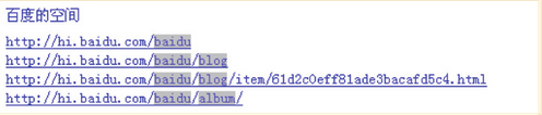 以百度空间为例,url结构中加入了用户id信息,用户在看到空间的url时,可以方便的判断是谁的空间。url结构中还加入了blog、album等内容信息,用户可以通过url判断将要看到的内容是一篇博客,还是一个相册。