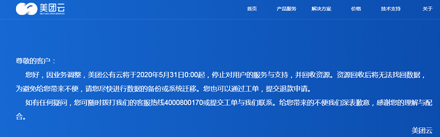 了解到,就在近期有报告显示阿里云和腾讯拿下国内云主机半壁江山之际,美团云宣布截止到2020年5月31日,美团云就要下线停止自家公有云对用户的开放服务,并开始清退资源,资源回收后将无法找回数据,用户有数据需要转移的,要尽快进行数据备份或系统迁移,也可通过工单,提交退款申请。