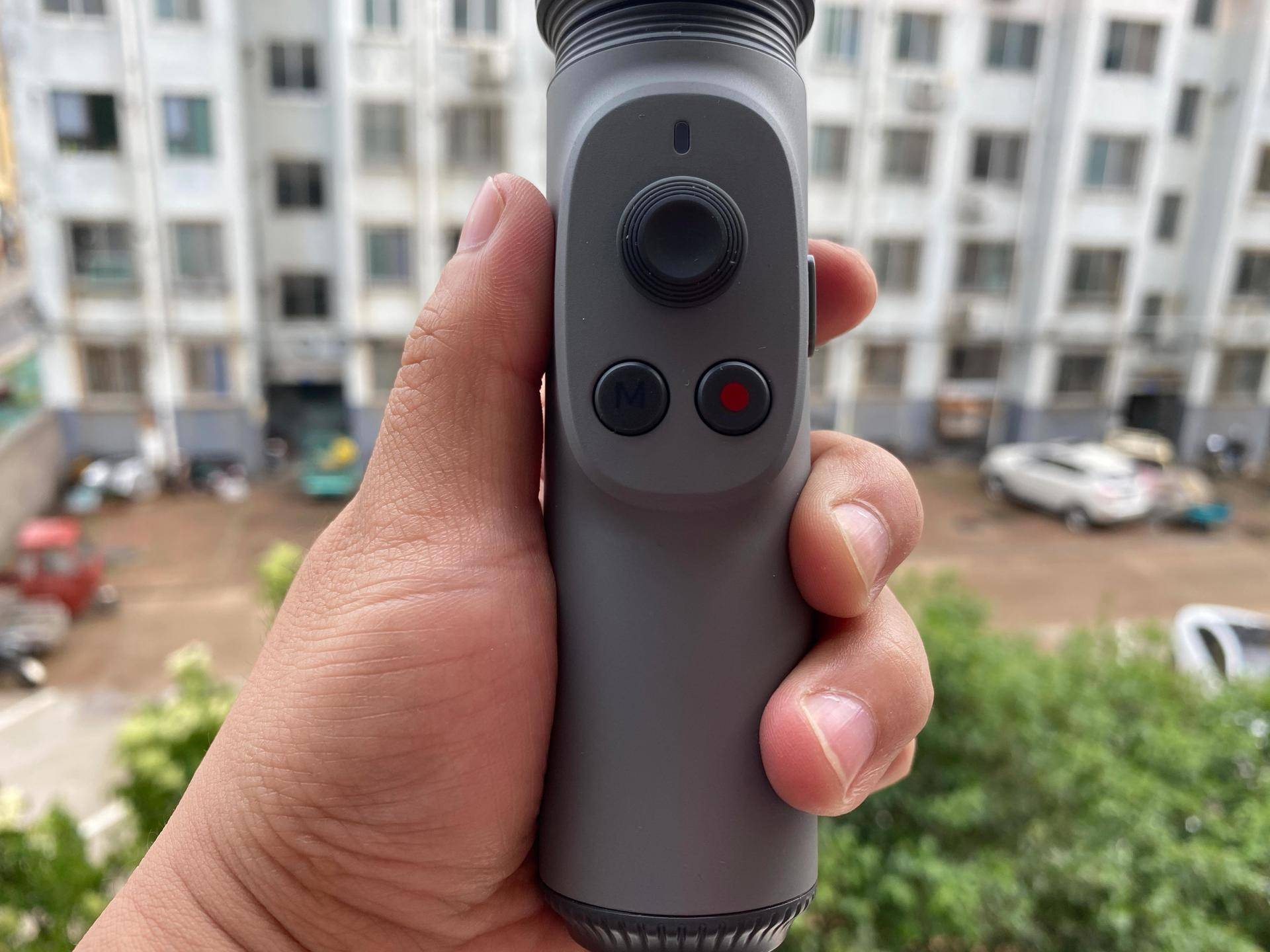 在云台摇杆的下面分别是M键,也就是我们经常提到的菜单按键,通过按键次数来实现模式跟随模式与锁定模式和横竖屏拍摄模式的快速切换,来真正实现快速切换。