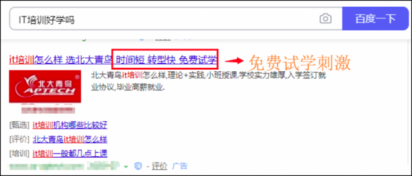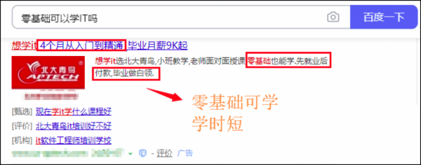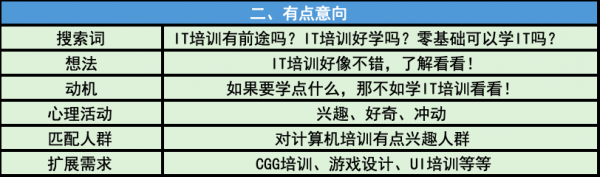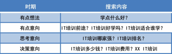 这个时候的网民大多已经有了需求,会有目标的区搜索,就觉得IT培训好像还不错啊,我要去搜索一下了解一下,这种时候各位SEMer需要考虑的是,用户会怎么搜,十日后一般会拓展性的做一些词,比如IT培训出来好找工作吗、IT培训前景怎么样、小白可以学懂IT吗,这类词会再一次加深用户的需求。