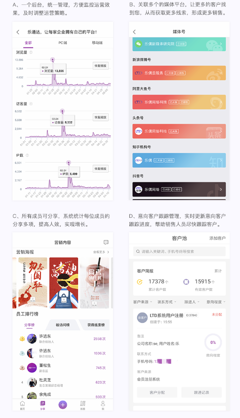 Ps:基于大多企业员工分享企业信息都是朋友圈、微信群的习惯。在选择LTD营销SaaS 搭建的网站企业,企业还拥有海量营销海报,企业员工还可通过分享海报的形式去做宣传,让每个人与客户连接起来,使推广变成每个人触手可及的事。