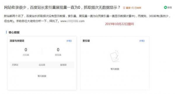新站都两个月了,百度站长抓取频次没有显示数据,索引量、展现量一直为0(而索引量一直显示数据计算中),而搜狗、360却有(虽然少,但也有)。求助各位大佬给分析一下。