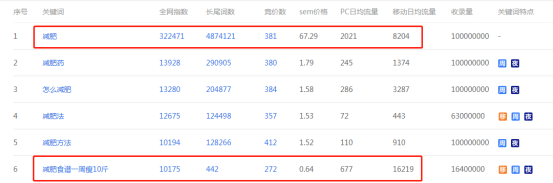 比如说,你们公司业务是做身材管理的,你可能觉得“减肥”这个大类目的行业词搜索流量应该很高,但其实“减肥食谱1周瘦10斤”的日均流量远超“减肥”。
