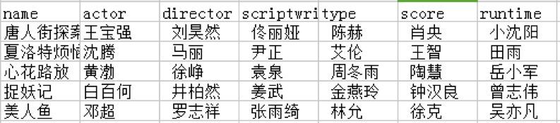从电影网站爬取数据:里面包括了“电影名”、“演员”、“导演”、“评分”、“类型”等信息: