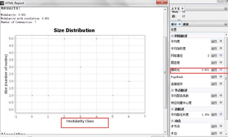 【第九步】对这些数据进行分类,分割出小团体(或小社区)(首先是使用社区探测算法对节点进行模块化处理,得到Modularity class参数,然后在“外观”中选择Modularity class参数,对节点按颜色进分割。)
