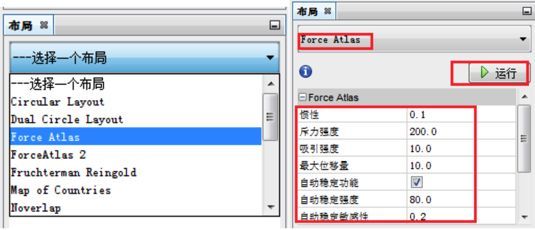 【第四步】对图片进行布局设置(软件提供了多种布局算法,选择某一种布局算法,还可以设置相关属性参数进行调整,点击”运行”执行该算法,示例中采取的是“Force Atlas”布局算法)