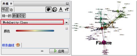 把不同小簇的节点加以区分,也就是小团体分类,不同的团体以不同的颜色标记;(最新版本这部分被合并在“外观”里)。