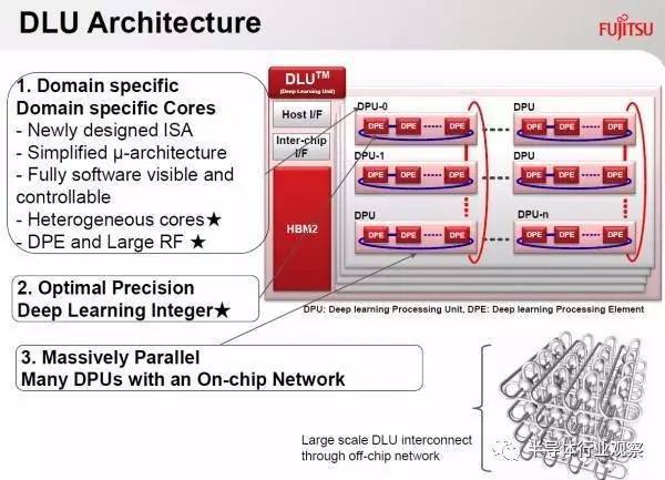 Deep Learning Unit。深度学习单元。Fujitsu(富士通)最近高调宣布了自家的 AI 芯片,命名为 DLU。名字虽然没什么创意,但是可以看到 DLU 已经被富士通标了「TM」,虽然 TM 也没啥用。在其公布的信息里可以看到,DLU 的 ISA 是重新设计的,DLU 的架构中包含众多小的 DPU(Deep Learning Processing Unit)和几个大的 master core(控制多个 DPU 和 memory 访问)。每个 DPU 中又包含了 16 个 DPE(Deep-Learning Processing Element),共 128 个执行单元来执行 SIMD 指令。富士通预计 2018 财年内推出 DLU。
