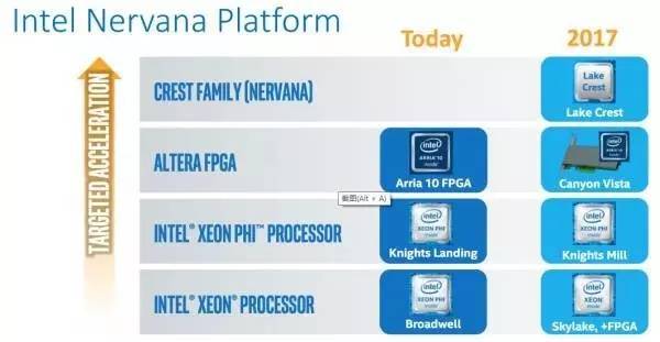 Nervana Nervana 成立于 2014 年,总部在 SanDiego,以提供 AI 全栈软件平台 Nervana Cloud 为主要业务。和硬件扯上关系的是,Nervana Cloud 除了支持 CPU、GPU 甚至 Xeon Phi 等后台硬件外,还提供有自家定制的 Nervana Engine 硬件架构。根据 The Next Platform 的报道「Deep Learning Chip Upstart Takes GPUs to Task」,Nervana Engine 使用 TSMC 28nm 工艺,算力 55 TOPS。报道发布不到 24 小时,就被 Intel 收购了,全部 48 位员工并入 Intel。Intel 以 Nervana Engine 为核心打造了 Crest Family 系列芯片。项目代码为「Lake Crest」的芯片是第一代 Nervana Engine,「Knights Crest」为第二代。哦,对了,Nervana 的 CEO 在创立 Nervana 之前,在高通负责一个神经形态计算的研究项目,就是上面提到的 Zeroth。