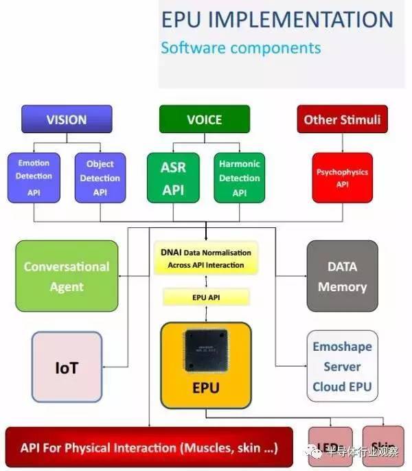 Emotion Processing Unit。Emoshape 并不是这两年才推出 EPU 的,号称是全球首款情绪合成(emotion synthesis)引擎,可以让机器人具有情绪。但是,从官方渠道消息看,EPU 本身并不复杂,也不需要做任务量巨大的神经网络计算,是基于 MCU 的芯片。结合应用 API 以及云端的增强学习算法,EPU 可以让机器能够在情绪上了解它们所读或所看的内容。结合自然语言生成 (NLG) 及 WaveNet 技术,可以让机器个性化的表达各种情绪。例如,一部能够朗读的 Kindle,其语音将根据所读的内容充满不同的情绪状态。