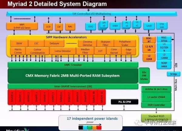 Movidius(已被 Intel 收购)。Movidius 成立于 2006 年,总部位于硅谷的 San Mateo,创始人是两个爱尔兰人,所以在爱尔兰有分部。Movidius 早期做的是将旧电影转为 3D 电影的业务,后期开始研发应用于 3D 渲染的芯片,并开始应用于计算机视觉应用领域(这说明:1,芯片行业才是高技术含量、高门槛、高价值的行业;2,初创公司要随着发展调整自己的战略)。Movidius 开发的 Myriad 系列 VPU 专门为计算机视觉进行优化,可以用于 3D 扫描建模、室内导航、360°全景视频等更前沿的计算机视觉用途。例如,2014 年,谷歌的 Project Tango 项目用 Myriad 1 帮助打造室内三维地图;2016 年,大疆的「精灵 4」和「御」都采用了 Movidius 的 Myriad 2 芯片。采用 TSMC 28nm 工艺的 Myriad2 中集成了 12 个向量处理器 SHAVE (Streaming Hybrid Architecture Vector Engine)。按照 Movidius 的说法,SHAVE 是一种混合型流处理器,集成了 GPU、 DSP 和 RISC 的优点,支持 8/16/32 bit 定点和 16/32 bit 浮点计算,而且硬件上支持稀疏数据结构。此外,Myriad2 中有两个 RISC 核以及 video 硬件加速器。据称,Myriad2 可以同时处理多个视频流。