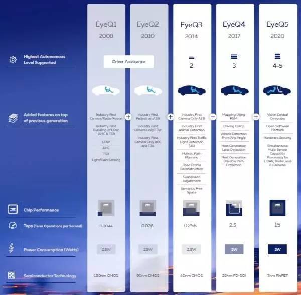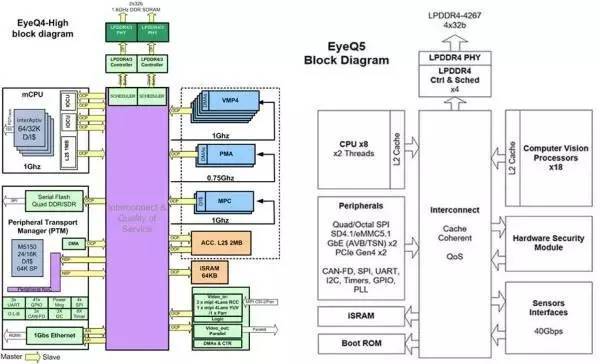 Mobileye一家基于计算机视觉做 ADAS 的以色列公司,成立于 1999 年,总部在耶路撒冷。Mobileye 为自家的 ADAS 系统开发了专用的芯片——EyeQ 系列。2015 年,Tesla 宣布正在使用 Mobileye 的芯片(EyeQ3)和方案。但是,2016 年 7 月,Tesla 和 Mobileye 宣布将终止合作。随后,Mobile 于 2017 年被 Intel 以$153 亿收入囊中,现在是 Intel 的子公司。Mobileye 的 EyeQ4 使用了 28nm SOI 工艺,其中用了 4 个 MIPS 的大 CPU core 做主控和算法调度以及一个 MIPS 的小 CPU core 做外设控制,集成了 10 个向量处理器(称为 VMP,Vector Microcode Processor)来做数据运算(有点眼熟,回去看看 Movidius 部分)。Mobileye 的下一代 EyeQ5 将使用 7nm FinFET 工艺,集成 18 个视觉处理器,并且为了达到自动驾驶的 level 5 增加了硬件安全模块。