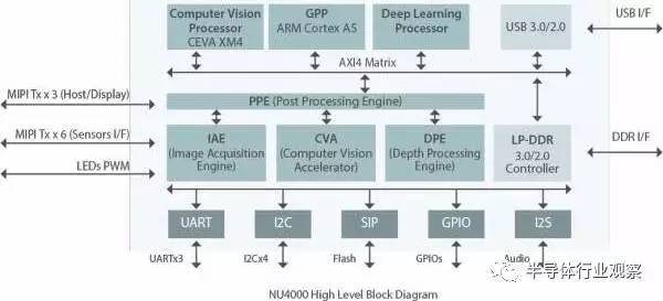 Inuitive 一家以色列公司,提供 3D 图像和视觉处理方案,用于 AR/VR、无人机等应用场景。Inuitive 的下一代视觉处理器 NU4000 采用 28nm 工艺,选择使用 CEVA 的 XM4 DSP,并集成了深度学习处理器(自己开发?或者购买 IP?)和深度处理引擎等硬件加速器。