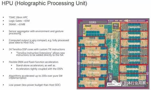 Holographic Processing Unit。全息处理器。Microsoft 专为自家 Hololens 应用开发的。第一代 HPU 采用 28nm HPC 工艺,使用了 24 个 Tensilica DSP 并进行了定制化扩展。HPU 支持 5 路 cameras、1 路深度传感器(Depth sensor)和 1 路动作传感器(Motion Sensor)。Microsoft 在最近的 CVPR 2017 上宣布了 HPU2 的一些信息。HPU2 将搭载一颗支持 DNN 的协处理器,专门用于在本地运行各种深度学习。指的一提的是,HPU 是一款为特定应用所打造的芯片,这个做产品的思路可以学习。据说 Microsoft 评测过 Movidius(见 VPU 部分)的芯片,但是觉得无法满足算法对性能、功耗和延迟的要求,所有才有了 HPU。