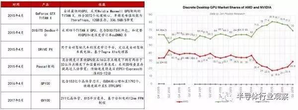 NVIDIA说起 GPU,毫无疑问现在的老大是 NVIDIA。这家成立于 1993 年的芯片公司一直致力于设计各种 GPU:针对个人和游戏玩家的 GeForce 系列,针对专业工作站的 Quadro 系列,以及针对服务器和高性能运算的 Tesla 系列。随着 AI 的发展,NVIDIA 在 AI 应用方面不断发力,推出了针对自动驾驶的 DRIVE 系列,以及专为 AI 打造的 VOLTA 架构。特别提一下 VOLTA,今年 5 月份,NVIDIA 发布的 Tesla V100 采用 TSMC 12nm 工艺,面积竟然 815mm^2,号称相关研发费用高达 30 亿美元。得益于在 AI 领域的一家独大,NVIFIA 的股价在过去一年的时间里狂涨了 300%。最后,也别忘了 NVIDIA 家还有集成了 GeForce GPU 的 Tegra 系列移动处理器。