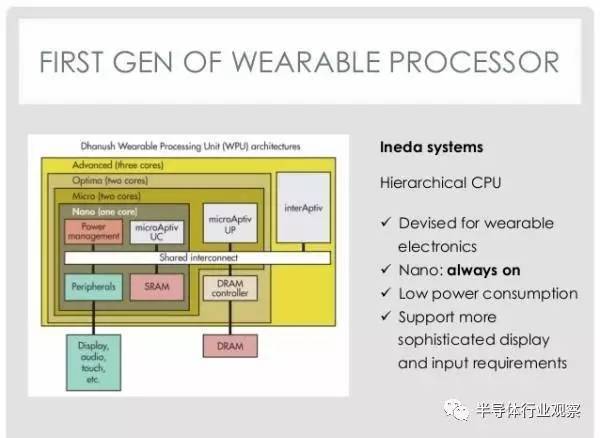 Wearable Processing Unit。一家印度公司 Ineda Systems 在 2014 年大肆宣传了一下他们针对 IOT 市场推出的 WPU 概念,获得了高通和三星的注资。Ineda Systems 研发的这款「Dhanush WPU」分为四个级别,可适应普通级别到高端级别的可穿戴设备的运算需求,可以让可穿戴设备的电池达到 30 天的持续续航、减少 10x 倍的能耗。但是,一切似乎在 2015 年戛然而止,没有了任何消息。只在主页的最下端有文字显示,Ineda 将 WPU 申请了注册商标。有关 WPU 的信息只有大概结构,哦,对了,还有一个美国专利。