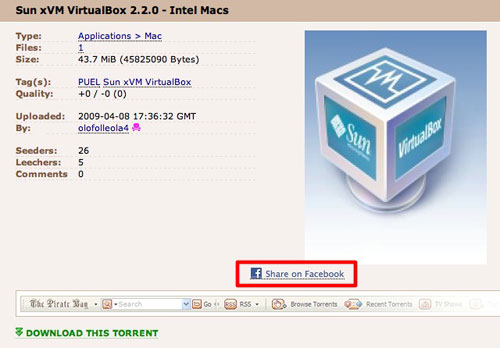 海盗湾是全球最大的BT种子网站。不久前,网站突发奇想,准备利用Facebook传播文件交换种子。随后,该网站在每一个文件交换的页面底部添加了一个“Share On Facebook”的按钮,这样,用户可以在Facebook页面上共享这些种子链接。