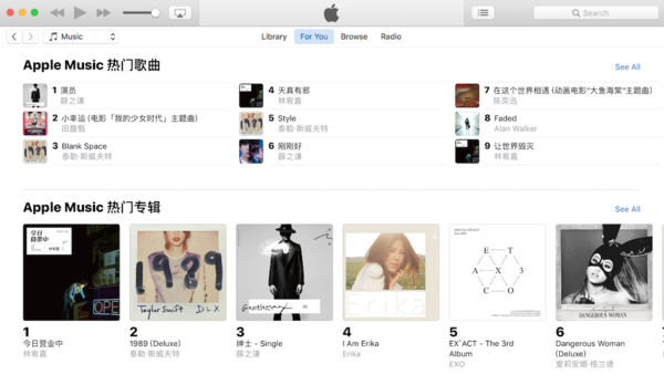 iTunes 的 For you 功能会智能推荐 Apple Music 的歌曲。