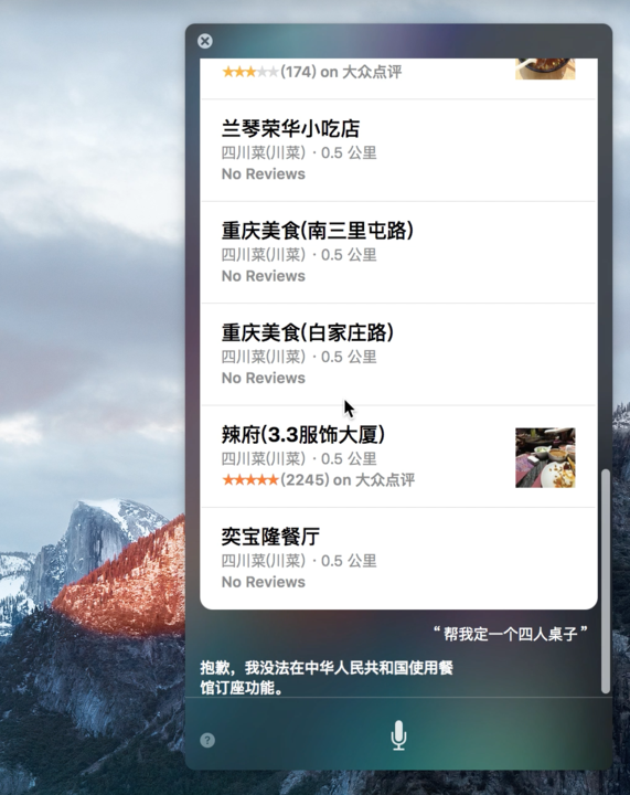 我们也用 Siri 尝试了搜索办公室周边的四川餐馆,并且尝试定一个 4 人桌,但目前在国内仅能进行搜索,餐馆预定的功能还不可用。