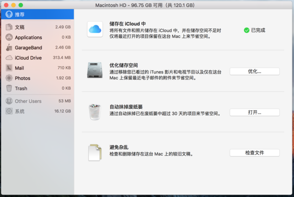 优化存储放在了【关于本机】的存储管理中,可以在其中查看是什么内容占用了空间,同时还能将文件按照大小,或者最后使用日期进行归纳,方便查找删除。