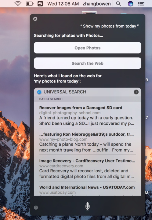 在说英文时,我故意用了一些歧义的语句,如:“Show my photos from today”, Siri 会主动给出选项,让我选择是从 photos 应用中找还是去网站上找图片。