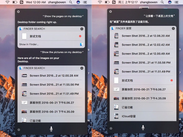 查找文件这一功能,如果我用英语与 Siri 沟通,它能够明确的帮我找到桌面上的 Pages 文件,并且给我看桌面上现有的图片。