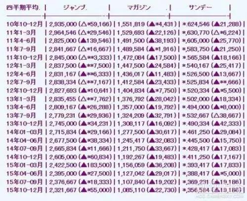 2015年的最后一个季度,日本三大漫画杂志《周刊少年JUMP》、《周刊少年SUNDAY》和《周刊少年magazine》环比下跌总计超过9.6万册,创下历史新低,尤其是集英社旗下的扛鼎期刊《周刊少年JUMP》,其销量仅仅只有二十年前全盛时期的三分之一。
