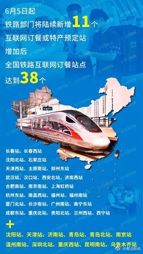 据高铁网消息,从中国铁路总公司获悉,从6 月 5 日起,铁路部门将陆续新增沈阳站等 11 个互联网订餐站点。增加后,全国铁路互联网订餐和特产预订站达到 38 个。