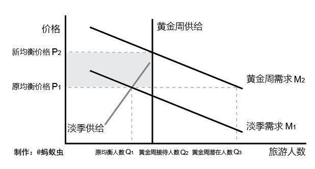 在黄金周高峰时段,时间上的宽裕让游客暴增,远远超过了日常规模,从而影响需求曲线。需求曲线发生了变化,大幅从向上移动从M1变成为M2。而在供给方面,旅游业无论采取何种方法,其接待能力都不可能突破硬件设施和人力条件的天花板,此时供给变得缺乏弹性,基本可将供给曲线视为一条垂直的直线。新需求曲线与黄金周供给曲线相交于P2,重新达到市场均衡,此时旅游价格从P1增长到P2。P2与P1之间的差值,就是游客体验到的黄金周旅游服务大幅涨价,酒店贵了、吃饭贵了、机票和客运票贵了。下图中的灰色块部分,即(P2-P1)×Q2,就是游客为黄金周出行旅游而多付的金钱代价,同时也是旅游业在黄金周获得的超额高收益。