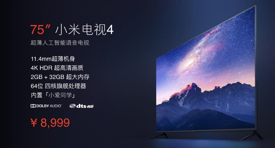 此前小米电视4系列已有49英寸、55英寸、65英寸的型号,这一次小米推出了更大的屏幕尺寸——75英寸,屏幕分辨率达4K,采用Amlogic第6代画质引擎。