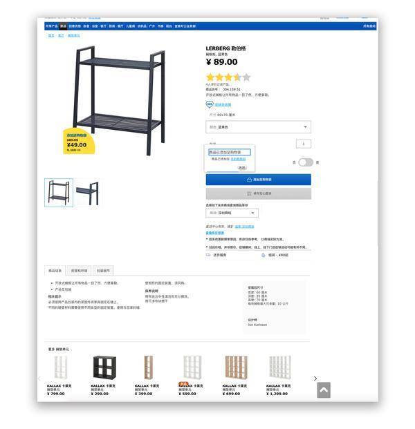 宜家所谓的网上商城,其实就还是原本的官网,网页布局基本没变,还是熟悉的配方,还是熟悉的味道。最大的差别在于商品的详情页,增加了购物车、库存、型号/颜色选择等必备功能。