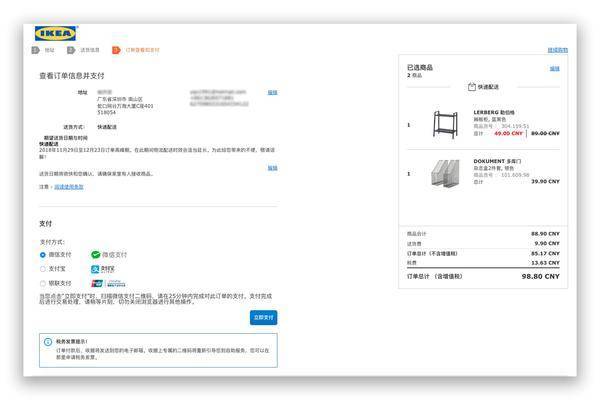 在掏钱购买这个环节,宜家的交互逻辑还是清晰的,只是页面很素,感觉和亚马逊的页面风格比较像。