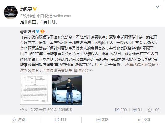 而在本月 23 日,顾颖琼在其个人自媒体平台上刊登声明,承认其之前关于贾跃亭的内幕爆料均是“虚假言论”,并正式公开道歉。如今法院也对其下达了永久禁令,这意味着该案件以贾跃亭胜诉落下帷幕。贾跃亭对此在微博回应:“是非曲直,自有日月”。