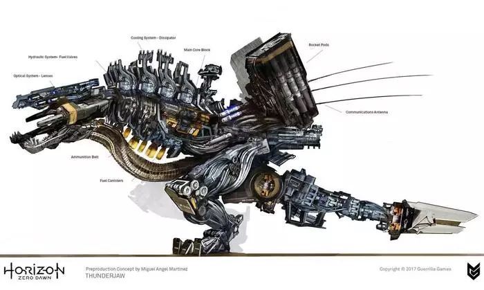 但要想绘制《地平线:零之曙光》中的机器人,照相测量法并不适用,因为从燃料线、装甲、液压接头、动力电池、肩载火箭发射器、机枪到装满了红色、蓝色或绿色化学武器的半透明罐等等,每一台机器人恐龙的设计元素都太复杂了。