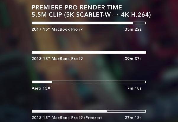 而 9to5Mac的测试则更有意思,他们选择了 Final Cut Pro 的 4K 视频渲染进行测试,但尝试用软件关闭了 i9 六核心中的其中两核,结果发现四核心的渲染速度会比六核心还要快几十秒,如果是在冰箱这样的低温环境下,速度还会有进一步的提升。