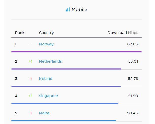 再来看看移动网速的排名。根据Ookla的最新报告,在全球移动网速排名中,挪威排在第一名,平均网速为62.66 Mbps,荷兰、冰岛、新加坡和马耳他紧随其后。