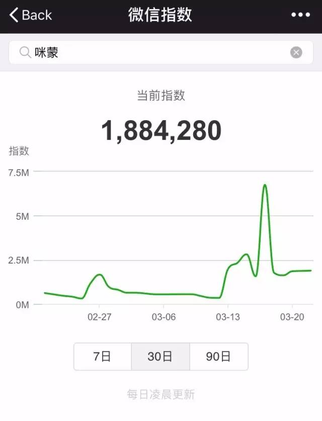 同时,微信指数与百度指数的量化标准不一样,百度指数搜索咪蒙30天的热度在19,000-22,000之间,但是现在微信指数出来了,同为30天的微信指数,达到了百万级别,咪蒙大大,快让你的助理看看微信指数,圈内之前流传的咪蒙涨价最任性算什么,半月翻一倍这种事今后可以更任性,数据这么“硬”,价格不能“软”,之前那篇《说来惭愧,我的助理月薪才五万》可以改成《微信指数,让我助理日薪五万》!